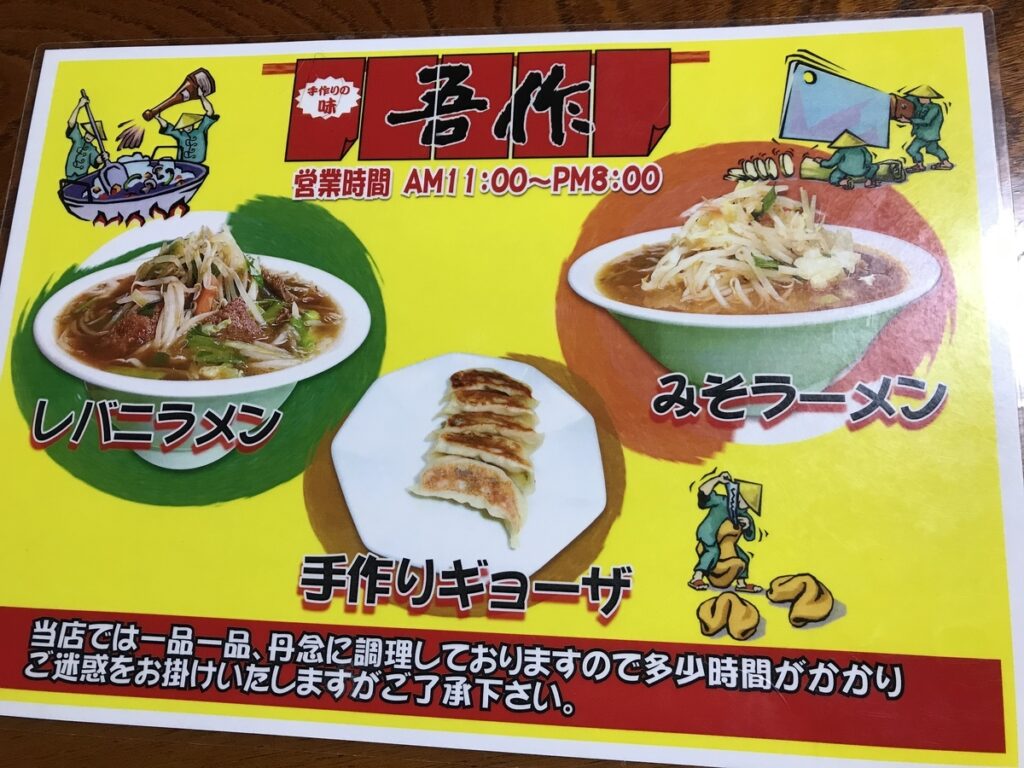 【むつ市】「吾作」ラーメン処/メニューや食レポ! グルメ X Facebook はてブ LINE コピー 2020.11.03 目次 「ラーメン処吾作/むつ市」来店レバニラメン 730円ギョーザ 280円サラレバメン!?メニュー表基本情報住所地図(Googleマップ) 「ラーメン処吾作/むつ市」来店 2020年11月3日、レバニラ目当てに来ました。 レバニラメン 730円 量がたっぷり多め! ギョーザ 280円 サラレバメン!? お皿で食べるサラレバメンってのもあるみたい です。 メニュー表 基本情報 住所 〒035-0067 青森県むつ市十二林2-1 地図(Googleマップ)